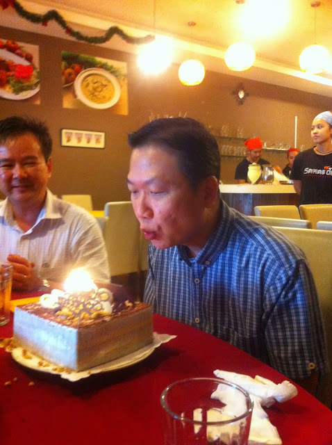 Nyam2 lagi. Hmmm. Bile kala la dapat nak diet ni. Xpe esokla. Hahaha. Selalu camtu. Kali ni celebrate Mr. Lawrence, disebabkan Lyna, my asst. yg selalu handle bab2 surprise ni da xde so, I yg xberape kreatif ni just buat care yg sangat2 simple jela. Itu je yg mampu I plan. Huahuahua. I booked this place n come separately with them as usual, so seems like nothing la. Chiew Wei da siap2 beli RT Pastry cake n pas to me. So, I n Lia bawa cake n waiting him at Sawasde Thai Kitchen & Cafe ni.